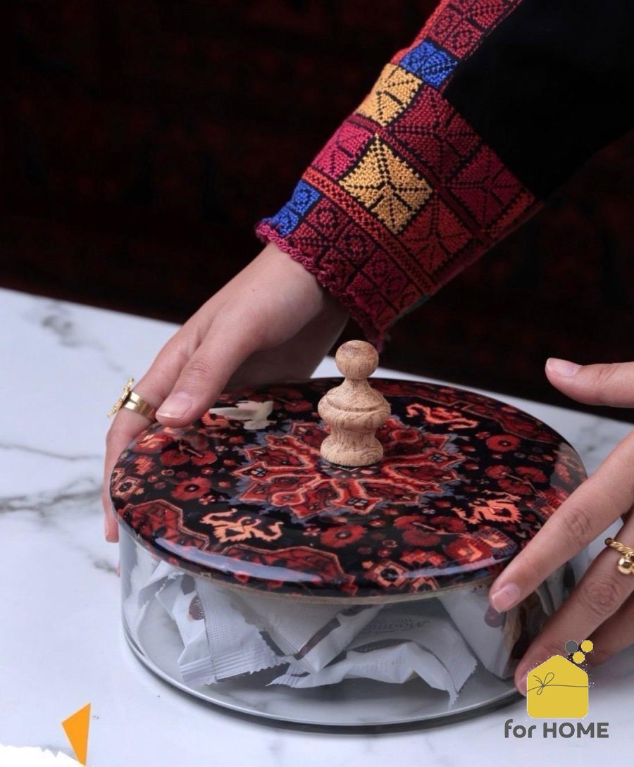 مضيفة زجاج مع غطاء خشبي بنقشة أفغاني