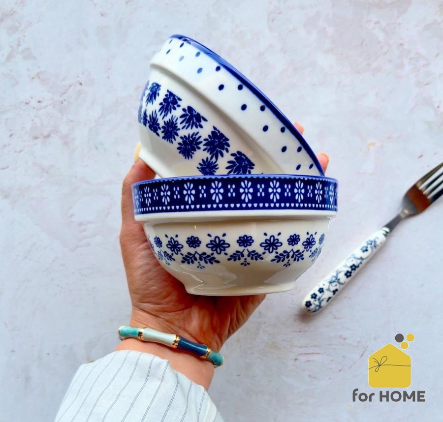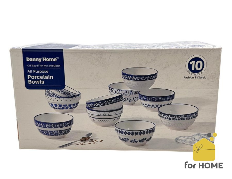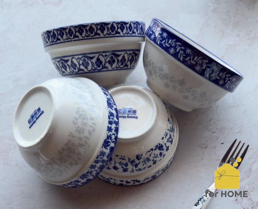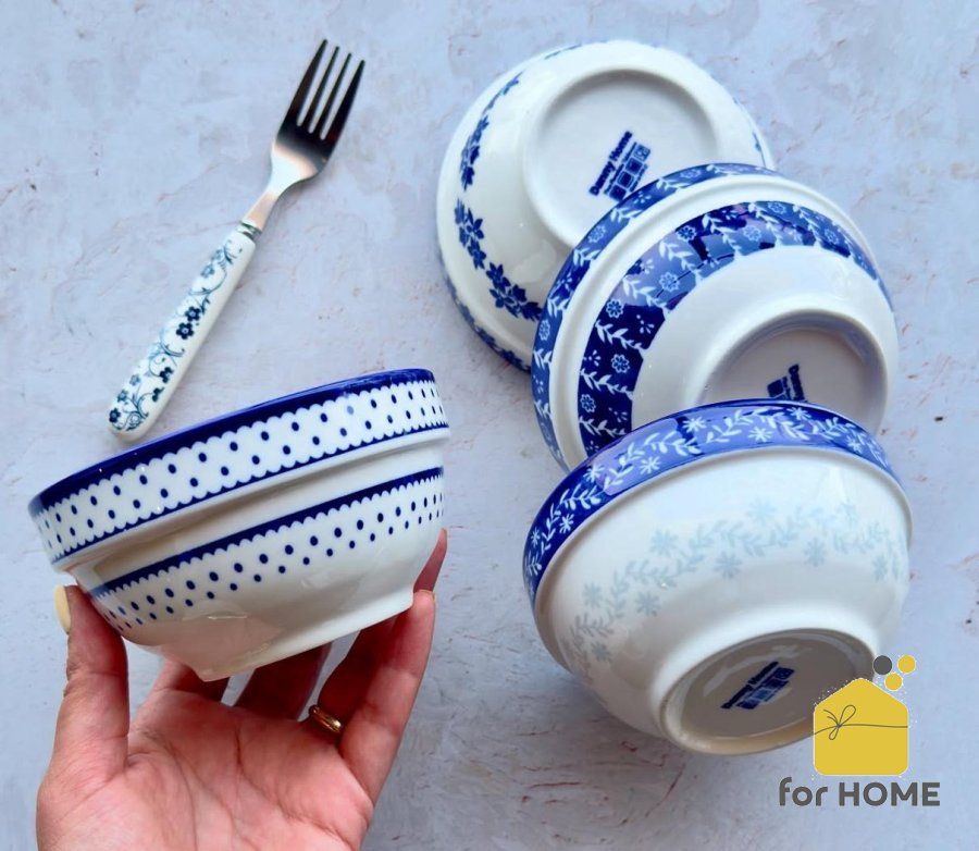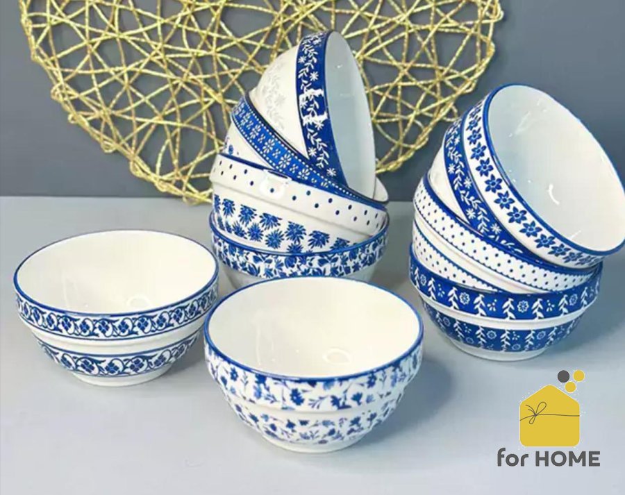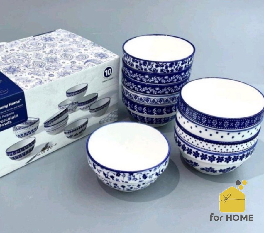 طقم صحون شوربة زبادي 10 قطع ازرق وابيض مع نقشة
